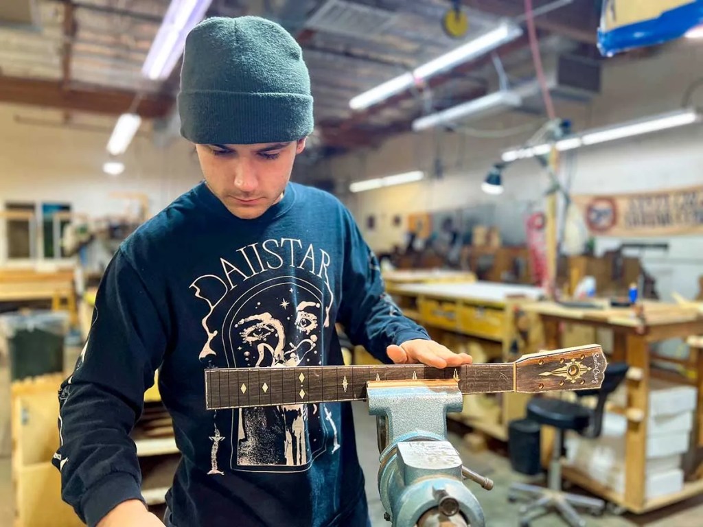 “I grew up in the middle of the San Joaquin Valley between Fresno and Bakersfield, and before the interstates [were built], the roads between the towns were lined with black walnut trees,” Hoover says. “When the trees were cut down to widen the roads, they went straight to firewood. I remember sitting there in front of the fireplace one Christmas, looking at a piece of walnut and just getting lost in the wood’s figuring. So using it in this guitar is a personal statement, and one of my goals is to get walnut the recognition it deserves as a tonewood—right up there with rosewood and mahogany.”