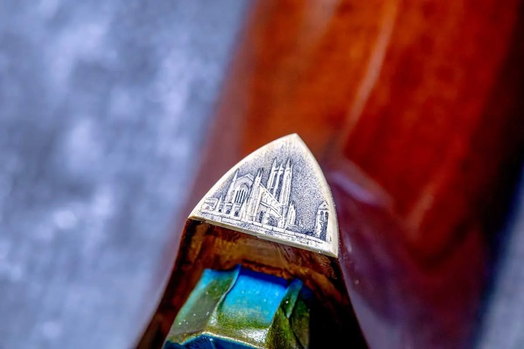 The guitar’s opulent embellishments include 45-style abalone purfling, rosette, and back strip; a new inlay style called Moderne Vault on the fretboard and bridge feet; and backlit tortoise (with a layer of white celluloid underneath to accentuate the tortoiseshell effect) neck and body binding. Then there’s the heel cap with a scrimshaw of the Bryn Athyn Cathedral and an ethically sourced diamond displayed behind a window in the headstock.