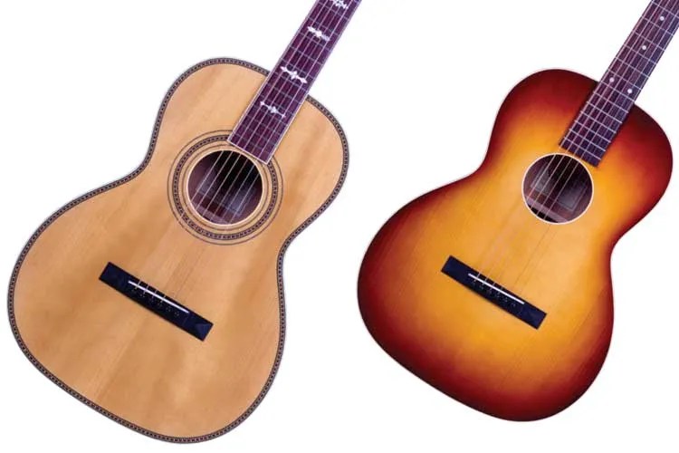 BODY 14-fret 00; solid Adirondack spruce top with hand-carved scalloped X-bracing; solid rosewood back and sides; ebony bridge; bone compensated saddle with 2-5/32″ spacing; herringbone purfling; firestripe pickguard; varnish sunburst finish