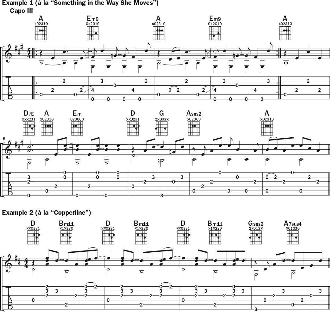 Also notable is what is not here: a steady alternating or monotonic bass, or any kind of set picking pattern. In bars 1 and 3, pick the bass notes on beats 1 and 4; in bars 2 and 4, on every beat; and in bar 5, only on the downbeat. Taylor’s style is based far less on repeating patterns or arpeggios than conventional folk/country fingerpicking. It’s more akin to keyboard playing, with the two hands working independently. The thumb leads with the bass line, and the fingers fill in around it with partial chords, single notes, and melodic figures.