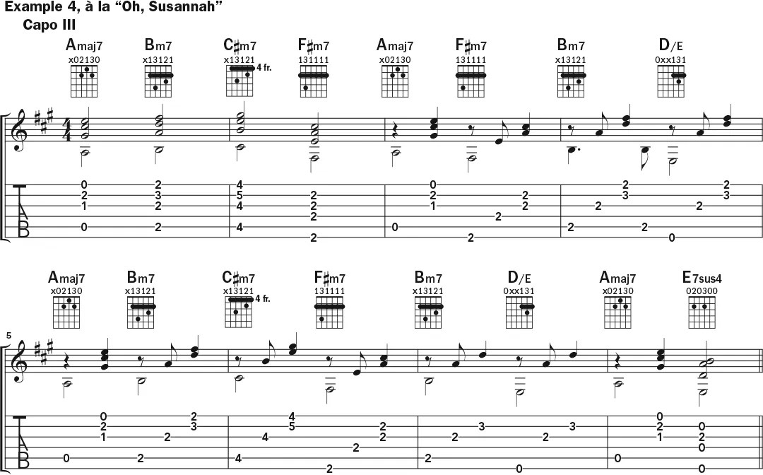In Example 4, capo at the third fret to play again in A (sounding as C), using all seventh chords. In measures 4 and 7, hold the Bm7 shape and just switch to a bass note to the open sixth string for the D/E. Taylor frequently uses voicings like this, with the bass note of the chord raised a step (as in C/D, A/B, etc.). Play freely, in sync with the vocals, and mix chords and arpeggios as you like.