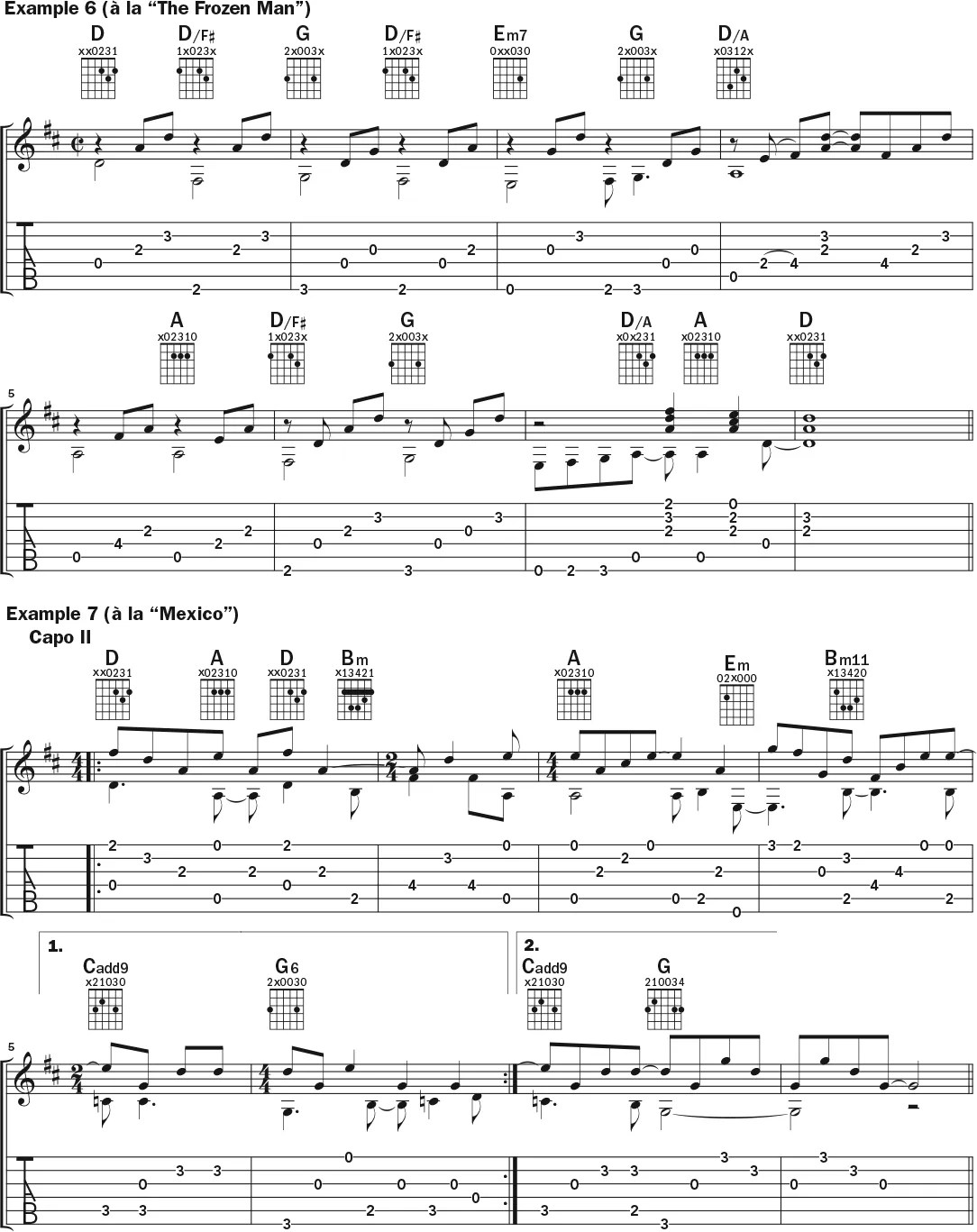 Put away the flatpick, grab a capo, and try Example 1, based on the intro and opening of the verse. As with everything in this lesson, pick the down-stemmed notes with your thumb and the up-stemmed notes with your fingers.