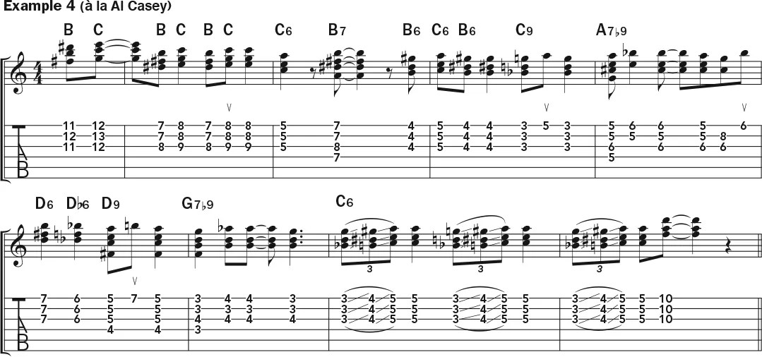 In June of 1937, Waller featured Casey for a full chorus, virtually unheard of at the time, on his Victor recording of “Blue, Turning Grey Over You.” Casey’s final eight bars in particular, similar to Example 4, show some of his favorite harmonic and rhythmic devices. The sixth and ninth chords that he often employed are present, as are his syncopated offbeat accents. Also of note is Casey’s heavier reliance on downstrokes, perhaps due to his focus on the guitar at an early age rather than tenor banjo. Casey also exhibits more internal harmonic movement than many of his Harlem-based contemporaries, something more prevalent in the playing of leading white jazz and dance band players from the same time such as George Van Eps, Carl Kress, or Dick McDonough.