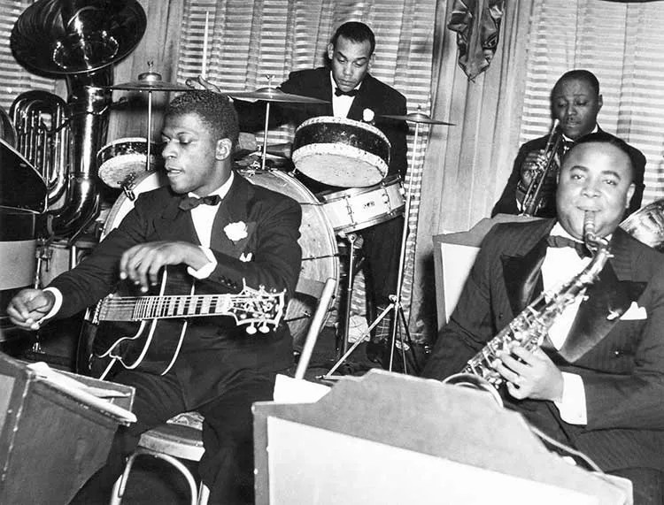 Freddie Green is synonymous with swing guitar. Born in Charleston, South Carolina, in 1911, Green enjoyed a 50-year career holding down the rhythm chair of Count Basie’s famed big band. Through that association—and due largely to his dedication to using an acoustic archtop as the primary timekeeper in a large jazz ensemble—his name not only is forever tied to an essential element of jazz, but has also become a shorthand term many guitarists know well. It has long been common for a player to be asked to “do a Freddie Green” and be expected to know what that implies: strictly rhythm, all chords, and nothing but steady, swinging quarter notes. But when one surveys the scene in early 1937, when in New York City, Green joined Basie’s orchestra of musicians from Kansas City and the Southwest, it quickly becomes apparent that Green was part of a larger tradition near its peak of practice.