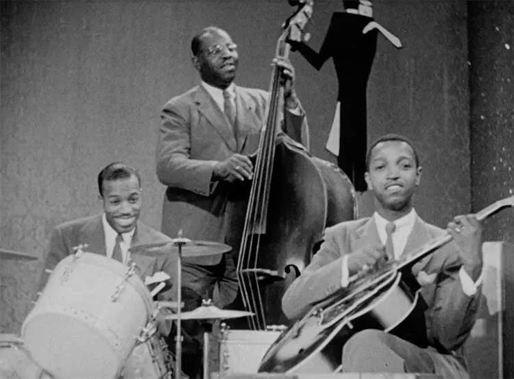 Exploring Green during the Old Testament years reveals the basic ingredients of the style for which he is so celebrated. In most photos from the period, Green can be seen in the standard big-band rhythm guitarist pose: seated, left leg over right, guitar resting at an angle on his knee. The angle could have been anywhere from 20 to 45 degrees, largely based on the acoustics of the venue. Basie eventually brought Green down beside the piano, but that was a late change in formation; most of the 1940s found the guitar player at the end of the trombones near the drummer’s hi-hat. This was functional, as the guitar and drums worked interdependently.