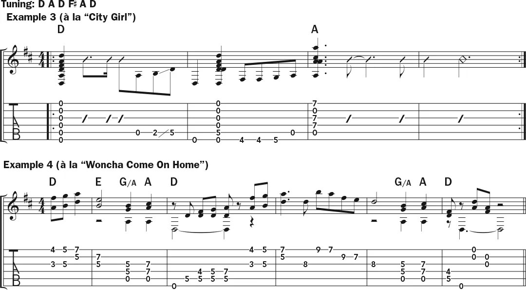 While Armatrading generally sticks with standard tuning, she does have some notable open-tuned songs, especially on her early albums. One is “City Girl,” from her debut, which is played in open D (D A D F# A D) with an opening riff similar to Example 3. Pick a bass line by sliding on the fifth string up to the fifth fret in the first measure, and then follow with a walk-up to the A chord.
