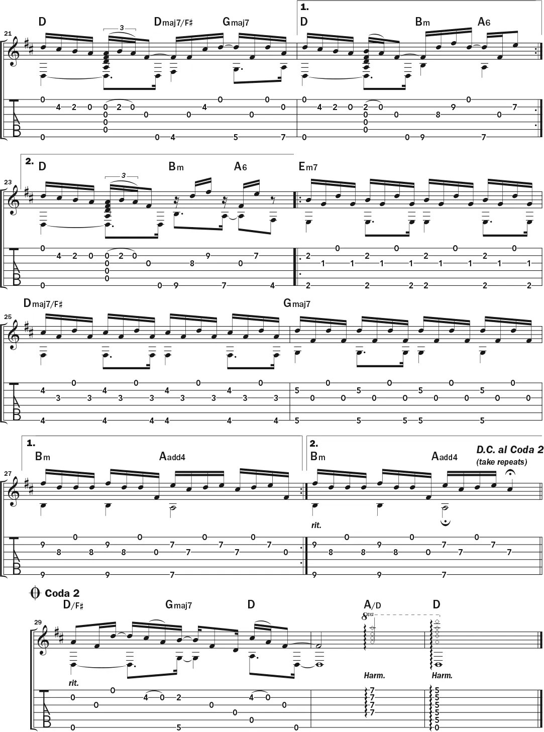 Williams says that the compositional process for “New Beginnings” was fairly simple. Tuning her guitar to open D, and placing a capo at the fourth fret, she sat down, started playing, and immediately happened upon the main theme (bars 1–2 of the notation here). “The other sections of the piece pretty much wrote themselves,” Williams says. “I believe this particular composition took me about a week to finish, which is a lot shorter than the usual amount of time I spend composing songs.”