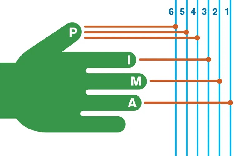 The biggest challenge of fingerstyle playing is getting your picking-hand fingers used to working independently. For beginners, the time-honored method of doing this is to assign each finger to a string and keep it there, with no deviation; that way there’s less chance of you getting confused. This method is time-honored because it works, and so I’ve used it for all five examples in the sidebar on page 29. To make the most of the examples, you’ll need to get acquainted with my old friend Pima, a.k.a. p-i-m-a, the standard system of symbols for the picking hand: p stands for the thumb, i is the index finger, m is the middle finger, and a is the third (ring) finger.