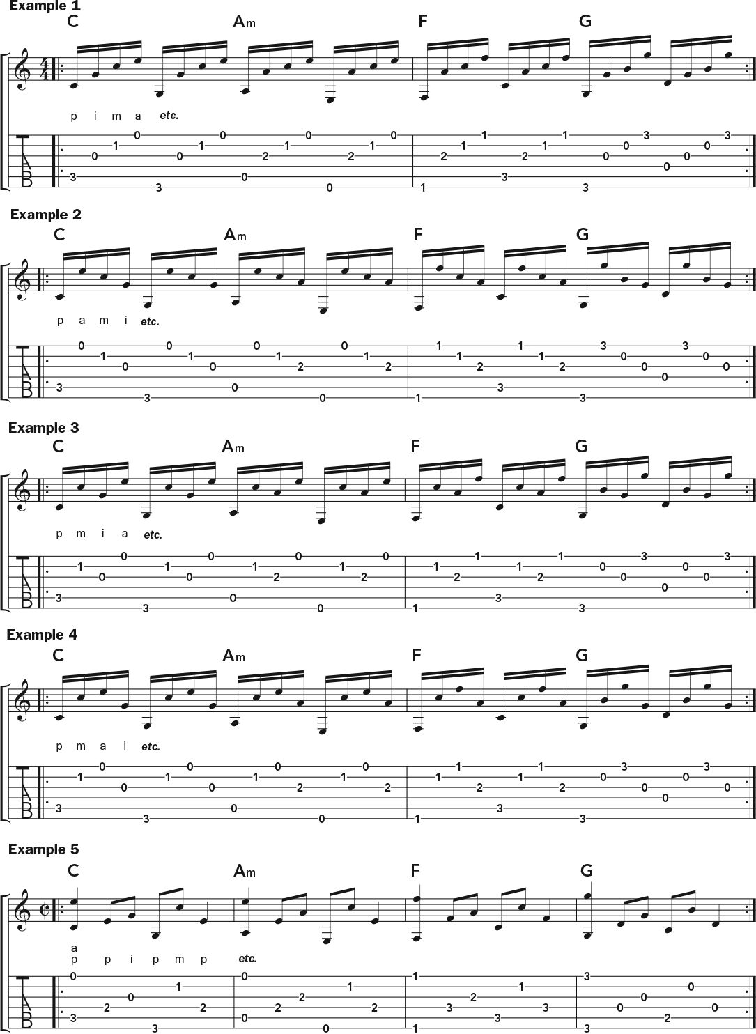 Learning how to pick fingerstyle can be frustrating at first. To make things easier, each of the following patterns employs the samqe classic I–vi–IV–V chord progression, C–Am–F–G, in first position and common time. In each pattern, the thumb (p) is the first thing you hear in every measure. It handles the quarter-note beats (1, 2, 3, and 4) while the first (i), middle (m), and third (a) fingers play the 16th notes in between (ee-and-ah).